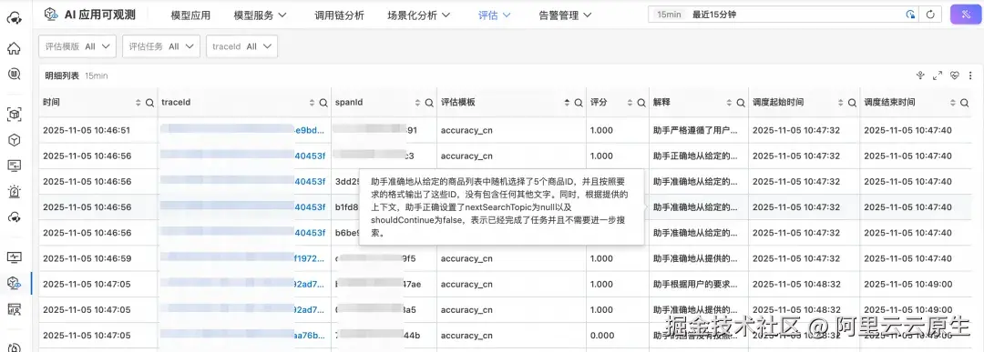云监控 2.0 在 SQL/SPL 中提供评估算子,和预处理计算无缝衔接。其中,评估算子无缝集成 Qwen 等最先进的大模型,提升 LLM Judger 的评估能力。下方是通用评估模板中的准确性 accuracy,我们可以看到 Qwen 大模型对每个评估任务给出了评分。