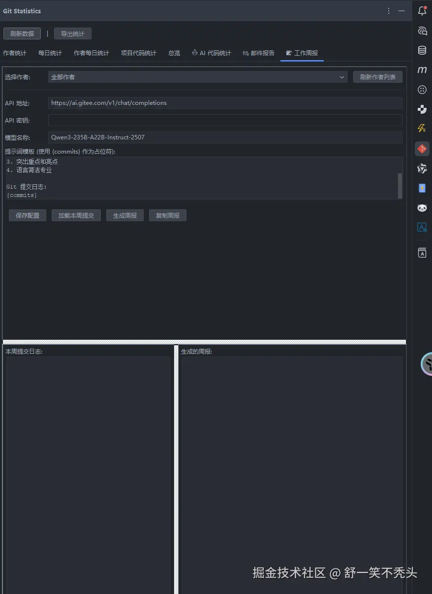 右侧工具栏 → Git Statistics → 📝 工作周报