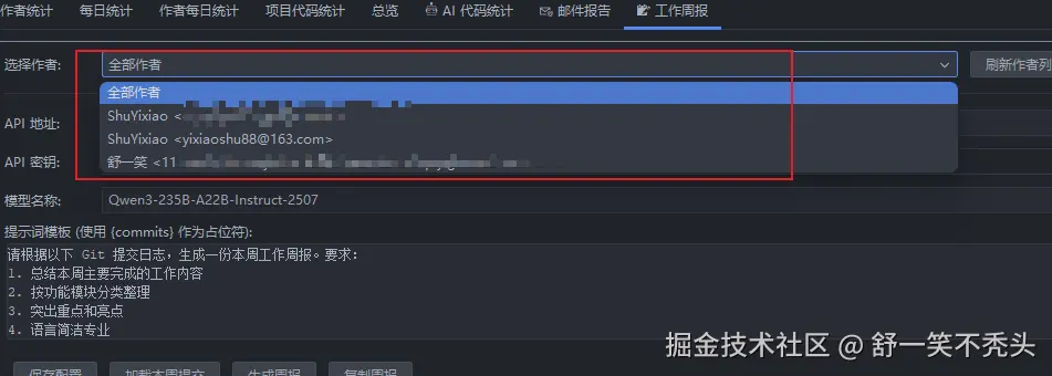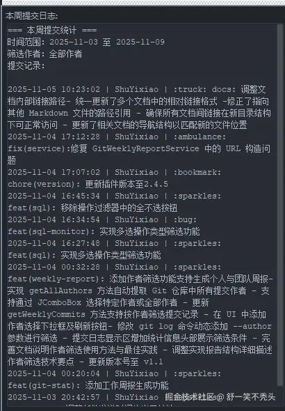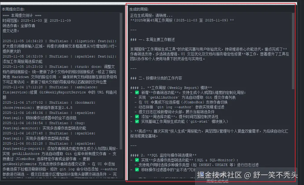 - 支持按作者筛选,生成个人周报或团队周报