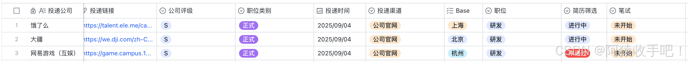 这里提供投递表格模板,当然可以做个参考自己做一个投递记录表,主要记录:投了哪些,简历状态,笔试状态,面试状态。做好投递记录!!!