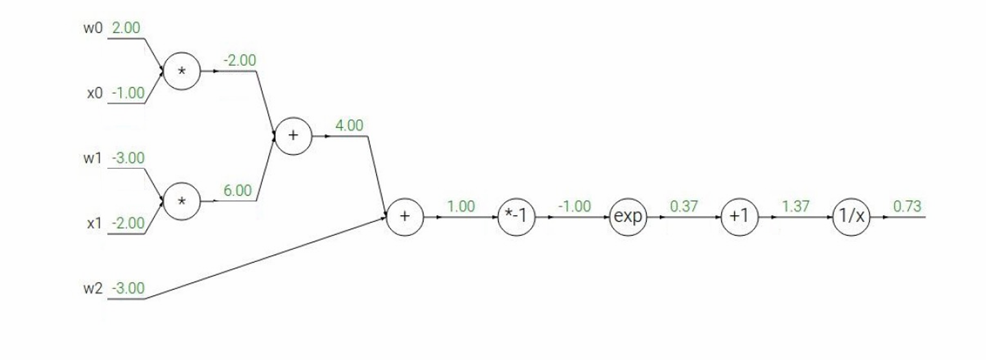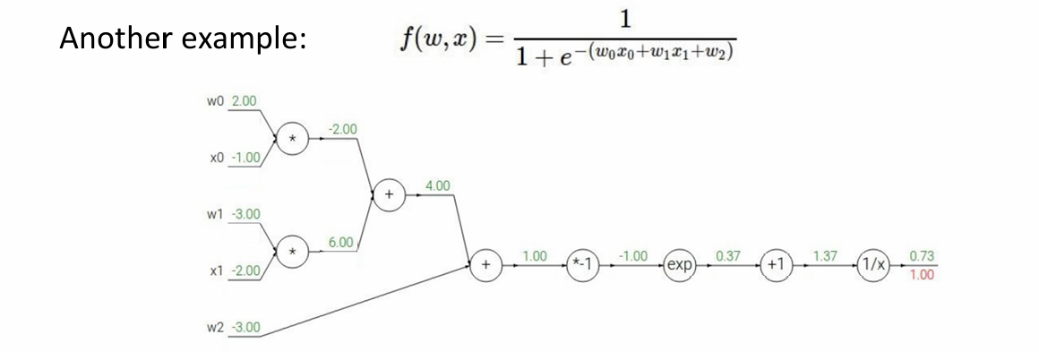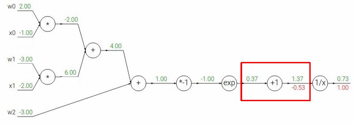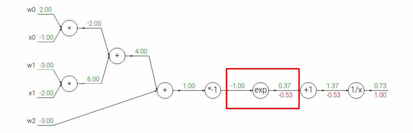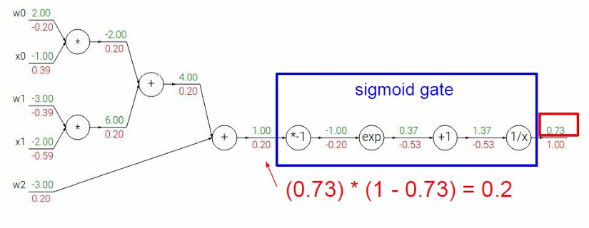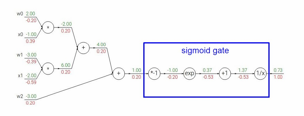 当然我们这里是一步一步通过链式法则解决的,我们也可以将其看作一个完整的函数也就是将整个 Sigmoid 函数看作一个计算节点(gate)。