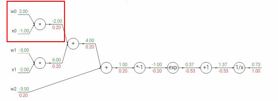 根据链式法则 ∂ L ∂ w 0 = ∂ A ∂ w 0 ∂ L ∂ A = x 0 × 0.20 = ( − 1.00 ) × 0.20 = − 0.20 \frac{∂L}{∂w_0}=\frac{∂A}{∂w_0}\frac{∂L}{∂A}=x_0×0.20=(−1.00)×0.20=−0.20 ∂w0∂L=∂w0∂A∂A∂L=x0×0.20=(−1.00)×0.20=−0.20