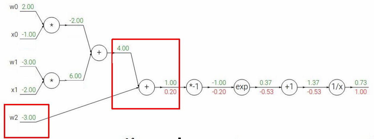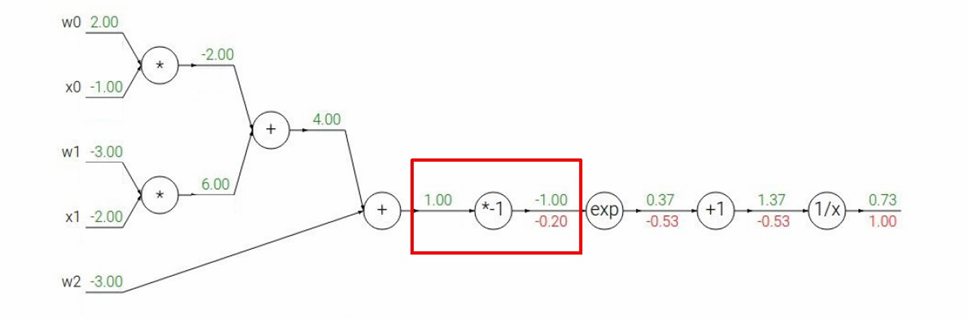 类似地,我们可以计算得到另一边 w 1 × x 1 w_1×x_1 w1×x1节点的结果是 ∂ L ∂ w 1 = ∂ B ∂ w 1 ∂ L ∂ B = x 1 × 0.20 = ( − 2.00 ) × 0.20 = − 0.40 \frac{∂L}{∂w_1}=\frac{∂B}{∂w_1}\frac{∂L}{∂B}=x_1×0.20=(−2.00)×0.20=−0.40 ∂w1∂L=∂w1∂B∂B∂L=x1×0.20=(−2.00)×0.20=−0.40