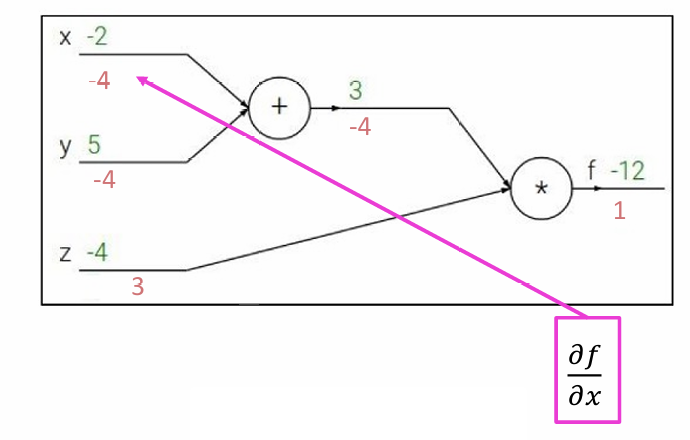计算 ∂ f ∂ x \frac{\partial f}{\partial x} ∂x∂f使用链式法则,可以得到 ∂ f ∂ y = ∂ f ∂ q ∂ q ∂ z = z \frac{\partial f}{\partial y} = \frac{\partial f}{\partial q}\frac{\partial q}{\partial z}=z ∂y∂f=∂q∂f∂z∂q=z