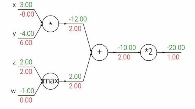 例子:上游梯度为 2.00,两个输入都得到 2.00 - 乘法节点(mul gate):梯度交换器(gradient switcher)