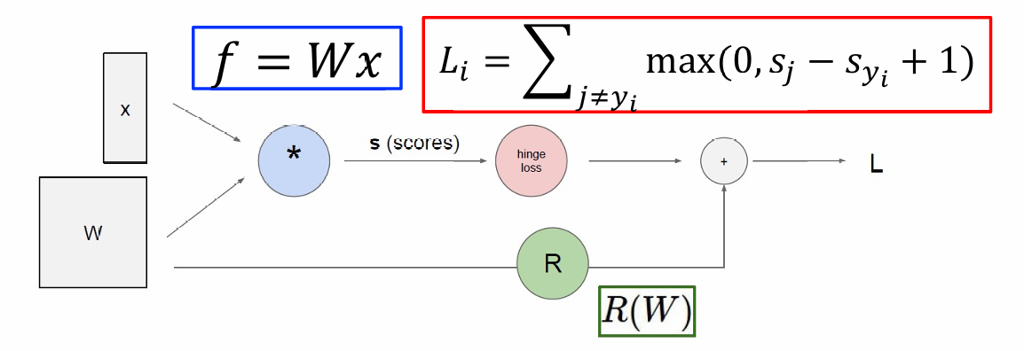 先通过输入和权重计算分数,然后算出单个样本的SVM损失,然后和正则化项一起得到总损失。