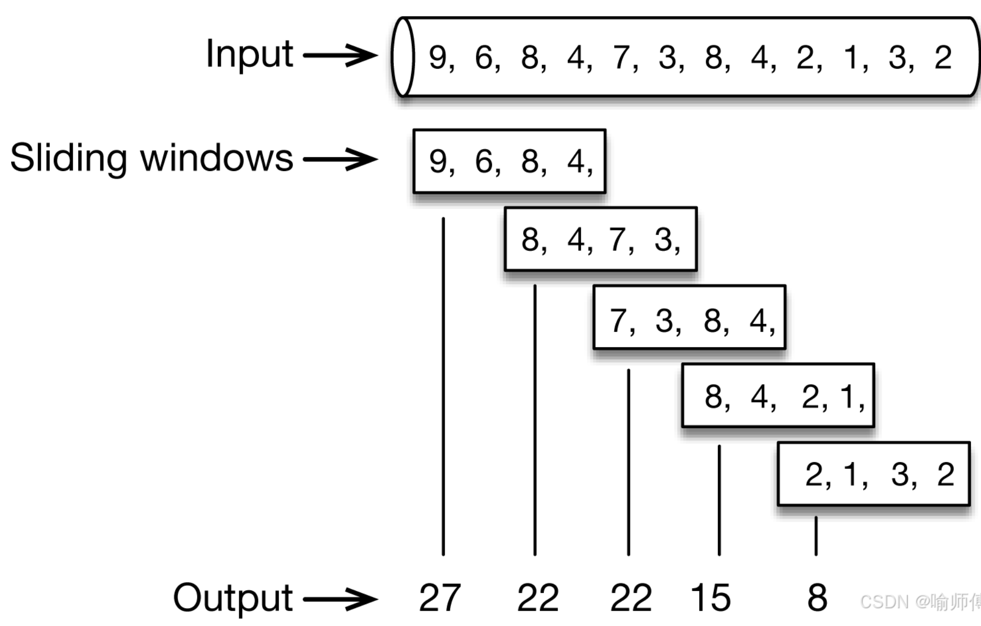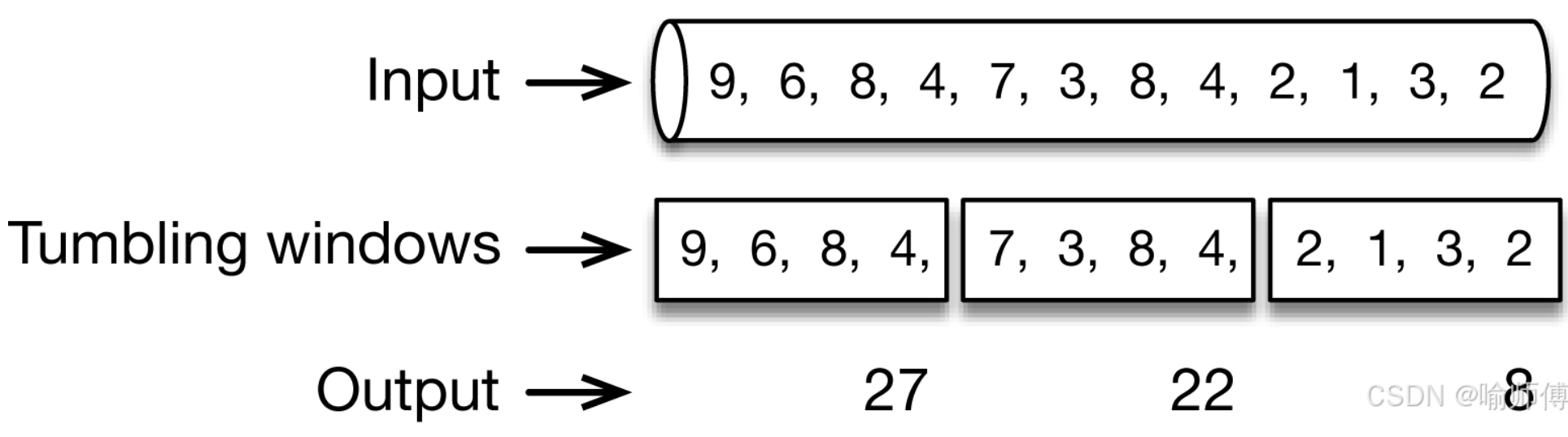 - 图表示意:假设时间轴为水平方向,从左向右推进,每一个滚动窗口就是一个固定长度的矩形块,依次排列,块与块之间没有间隙和重叠。