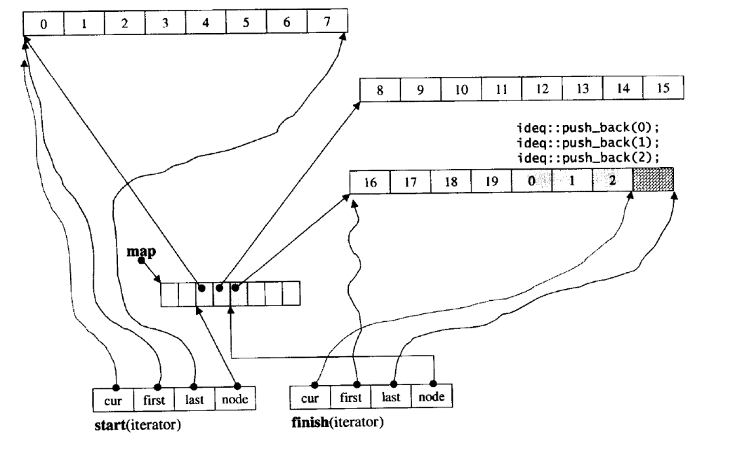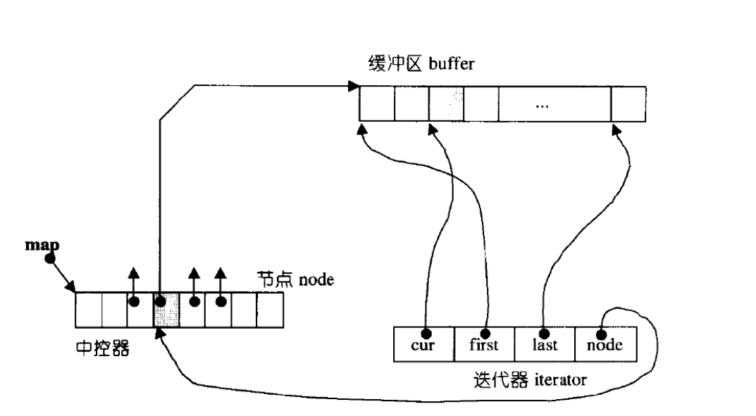 因此 deque 的迭代器设计就比较复杂,如下图所示: