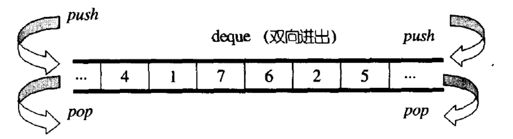 deque (双端队列):是一种双开口的"连续"空间的数据结构,双开口的含义是:可以在头尾两端进行插入和删除操作,