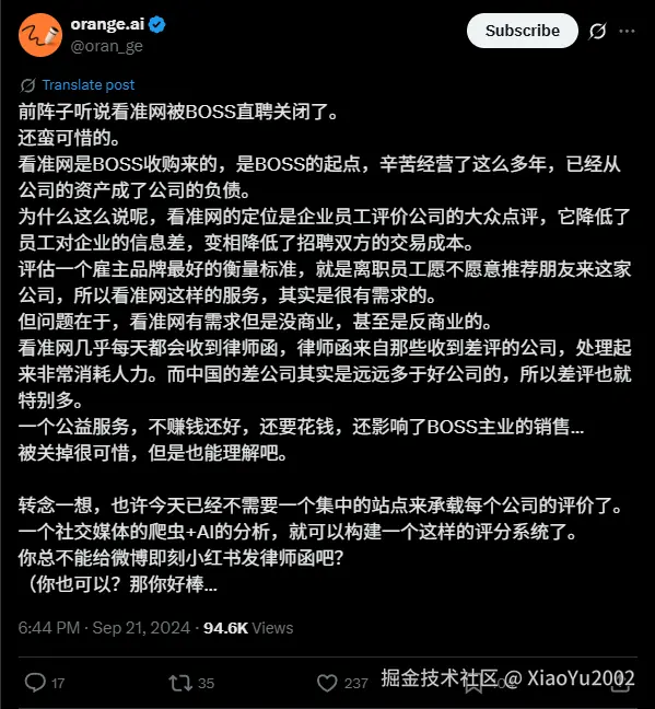 可惜看准网于2024年9月30日23:59:59关闭现有服务。推特用户对看准网关闭的看法如图1-2所示。我认为这是一件仁者见仁,智者见智的事情。既然已经关闭了,再讨论也无法改变实际情况。我觉得可以使用国家企业信息公示系统配合天眼查以及中国执行信息公开网来简单替代一下。