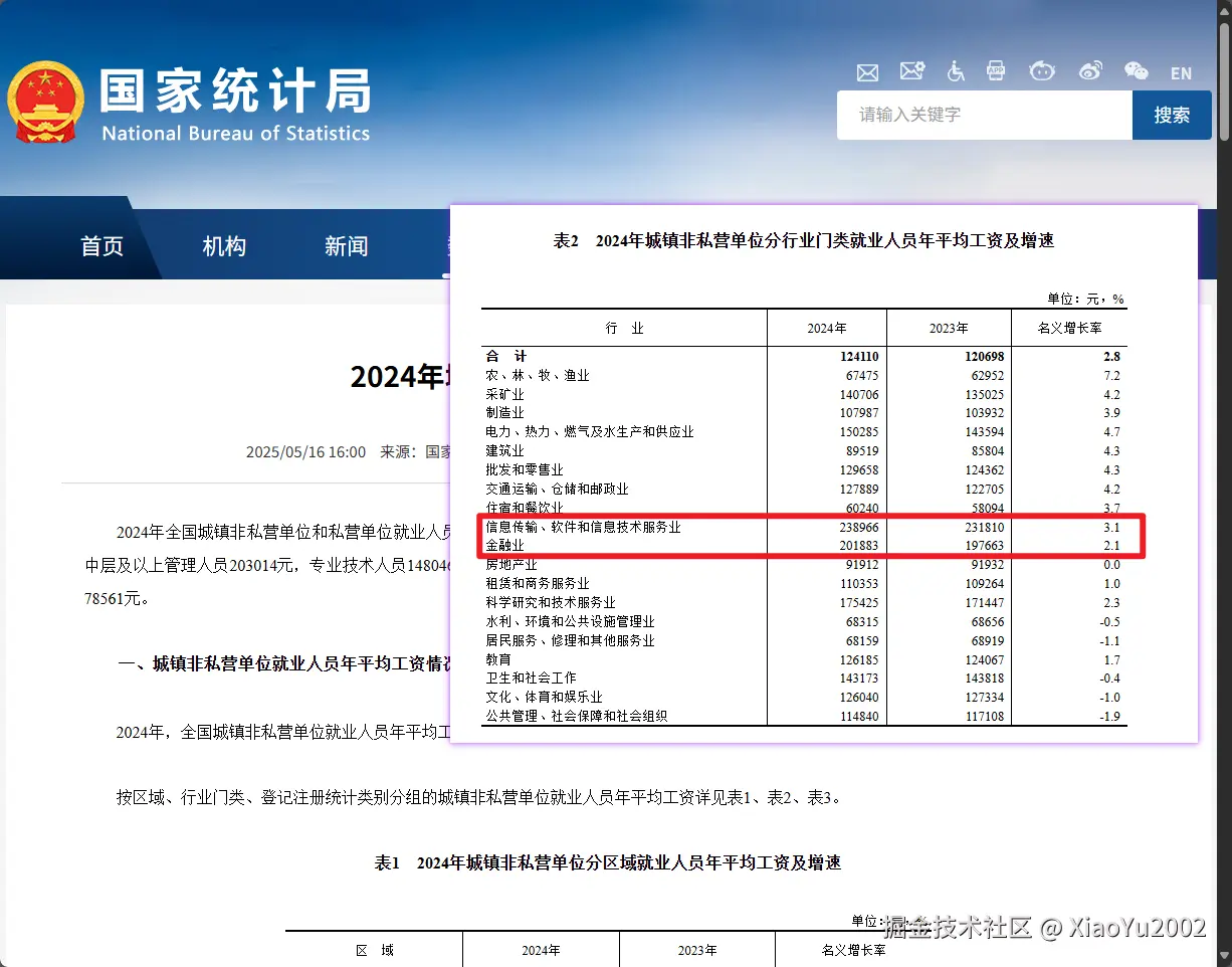 互联网的薪资是相对较高的,有可能超过互联网行业薪资的,可能也就金融行业。但金融非常吃学历、背景、资源。在国家统计局中的2024年城镇非私营单位分行业门类就业人员年平均工资及增速中,信息传入、软件和信息技术服务业的薪酬水准是超过金融业的,如图1-3所示。