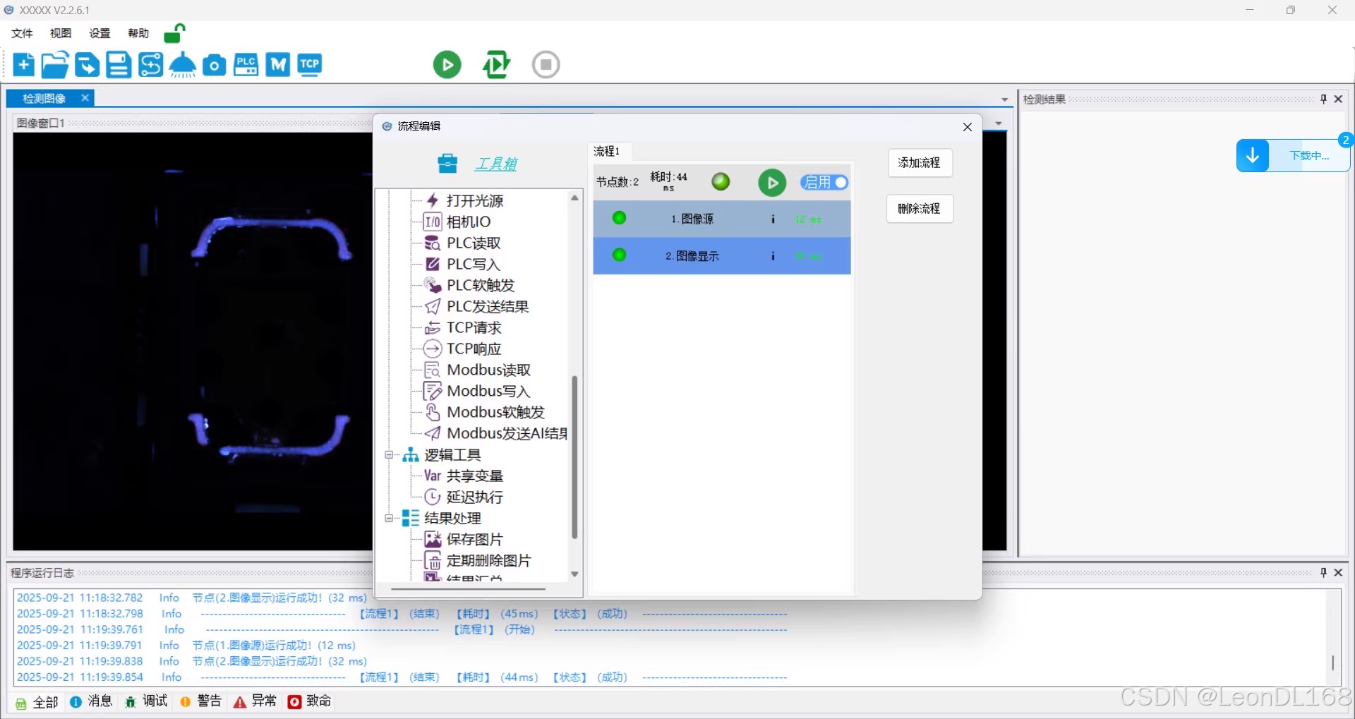 集成图像采集(相机接入)、预处理(滤波/增强等)、检测识别(轮廓/特征匹配)、测量(尺寸/角度计算)、设备通讯(PLC/串口/TCP)和逻辑处理,相当于把视觉项目开发的"积木"预制完成。开发者无需重复搭建基础模块,可直接聚焦业务逻辑(如缺陷检测规则、测量精度校准等),大幅减少从0到1的开发成本。
