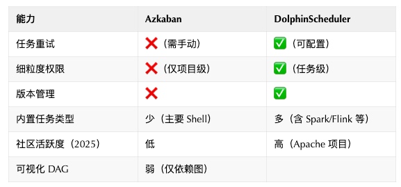 Azkaban 的权限模型只有"项目级别"的读写权限,无法做到"用户A只能编辑任务X,不能动任务Y"。在多团队共用一个调度平台时,权限混乱导致误操作频发。