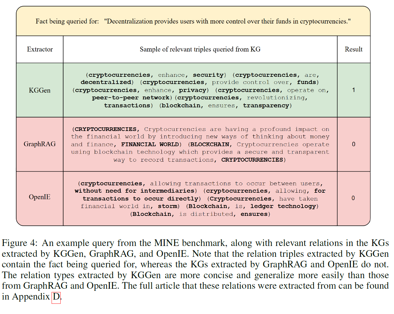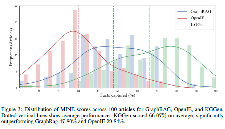 KGGen 以 Python 库的形式发布(可通过 pip install kg-gen 安装),使所有研究者都能方便使用。与此同时,作者还发布了首个名为 MINE(Measure of Information in Nodes and Edges) 的基准,用于评估抽取器从纯文本中生成有用知识图谱的能力。我们将该工具与现有抽取器进行了对比实验,结果显示 KGGen 在性能上显著优于其他方法。