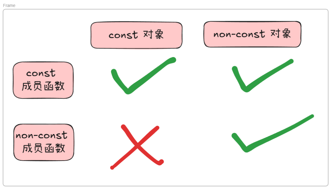 我在这里也简单列一张表。当成员函数的const版本与non-const版本同时存在时,常量对象只能调用const版本,非常量对象只能调用non-const版本,泾渭分明。