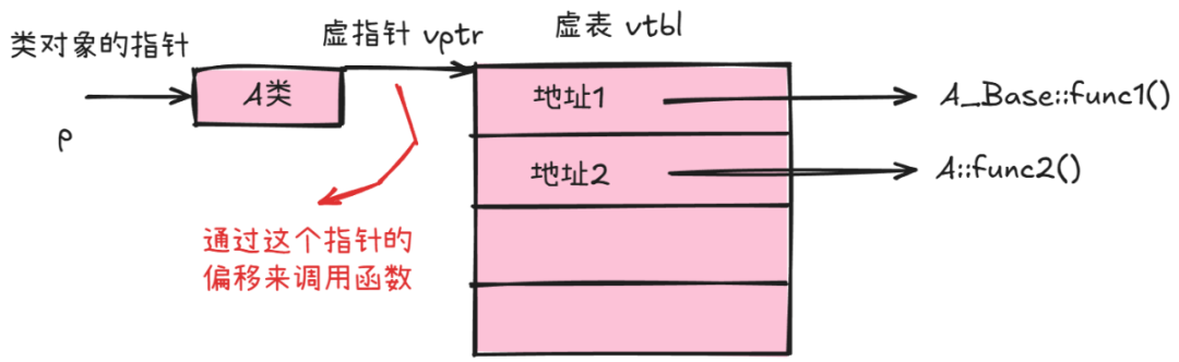 Ps:虚函数表与类绑定,虚表指针和对象绑定,二者是分离的。也就是说不同的对象维护各自的虚指针,但这些虚指针都指向同一份虚函数表。