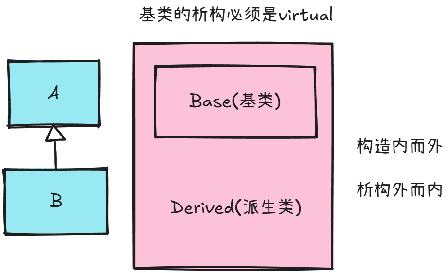 正常的继承关系下,析构函数总是先调用派生类的析构函数再调用基类的析构函数。但如果是父类指针指向子类对象时,没有virtual析构函数的话,delete指针只会看指针的数据类型,而不是赋值的对象。这样一来就会只执行父类的析构而错过了子类的析构,造成内存泄漏(仅释放了子类中父类的那块空间)。