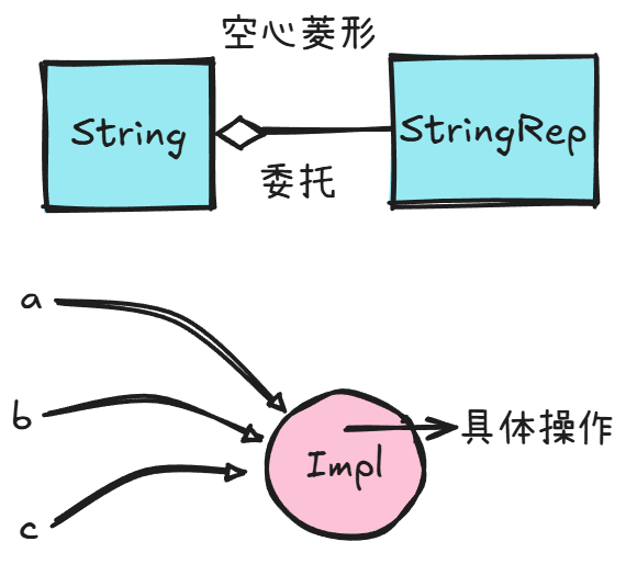 这引出了一个很好的程序设计即"pImpl"(第二个字母是i,大写),指针指向实现。很多设计如策略模式,前文的智能指针都使用了这种方式。让一个类(String)对外提供接口,称为"Handle",内部指针指向的对象(StringRep)负责真正的实现,称为"Body"。这样一来拓展性很强,指针可以指向不同的实现,从而实现多种行为的切换。