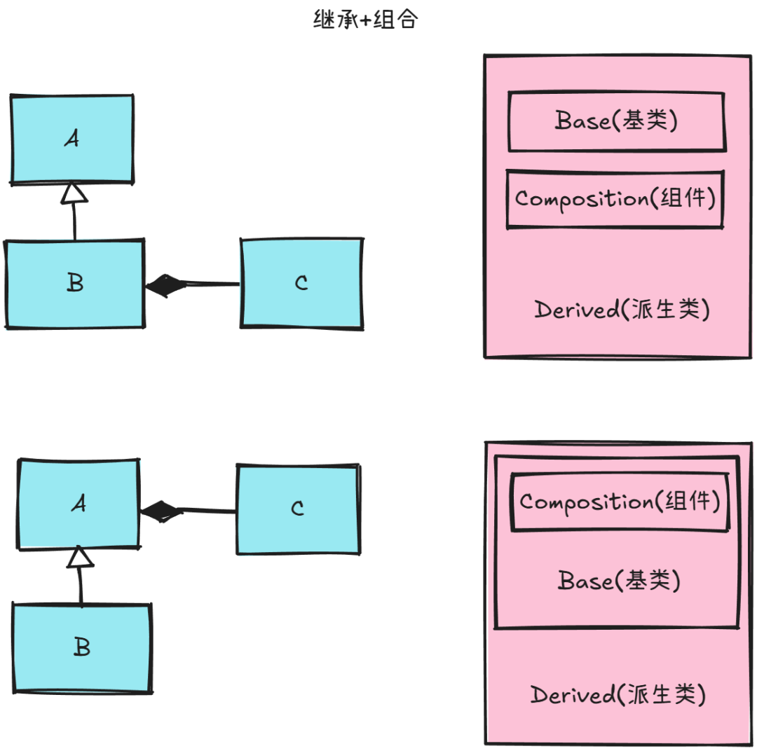 另一种就是委托+继承的结构。观察者模式就是很好的例子,主题中维护了一个观察者的引用列表(委托),不同的观察者都继承自一个观察者父类实现更新接口(继承)。