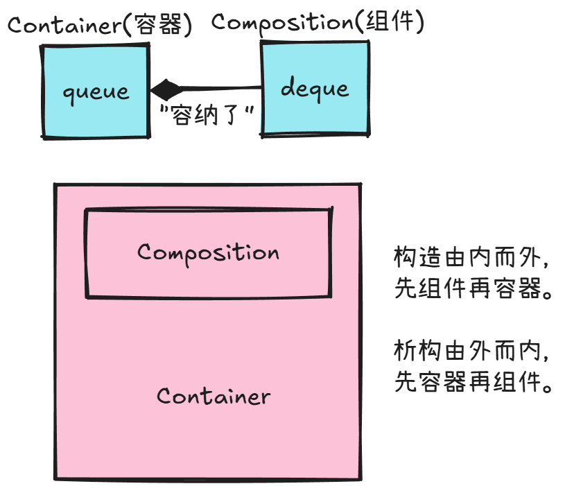 如上图,实心菱形表示组合关系。先调用成员对象的构造,再调用自身的构造(还记得之前讲的构造函数体前初始化成员吗)。