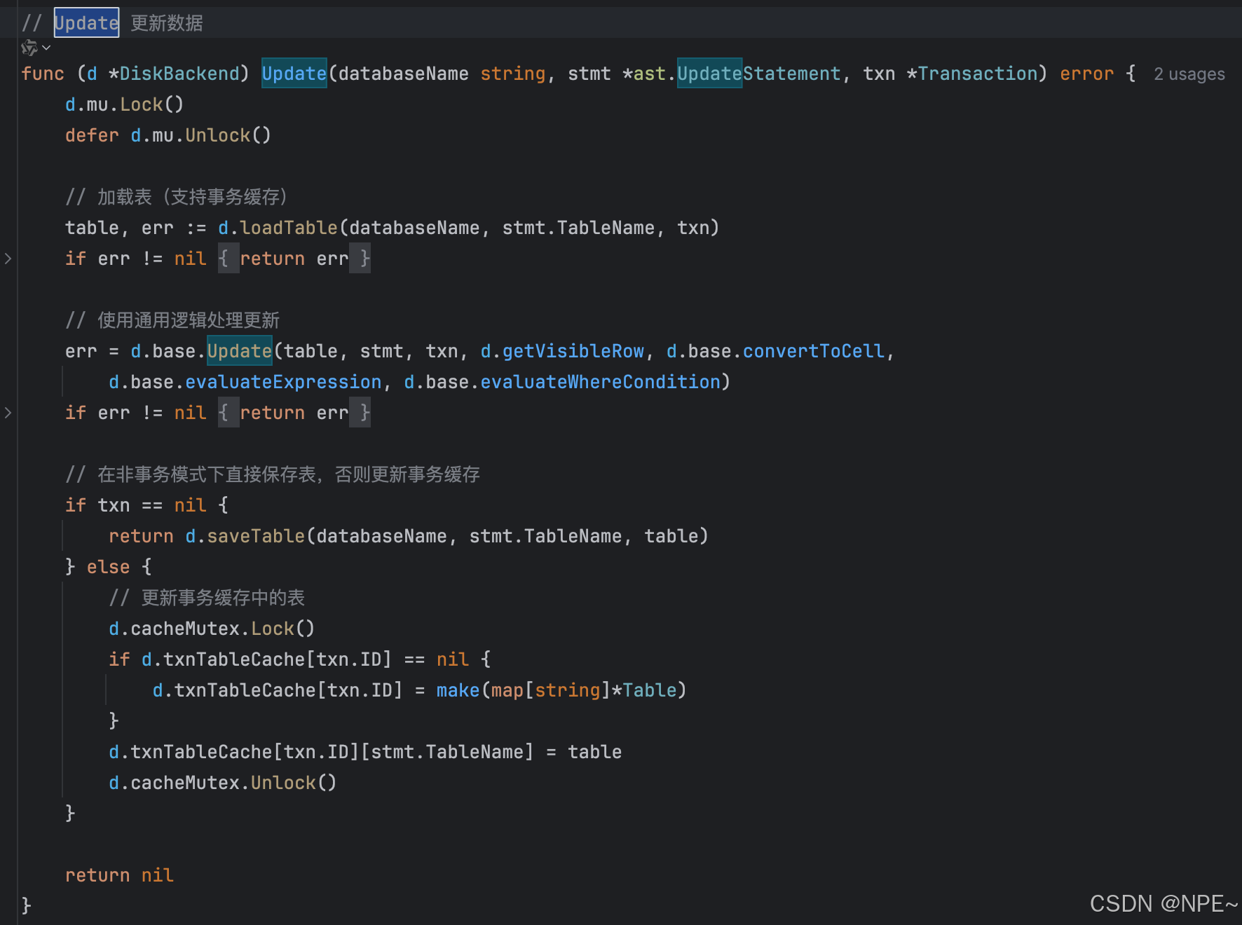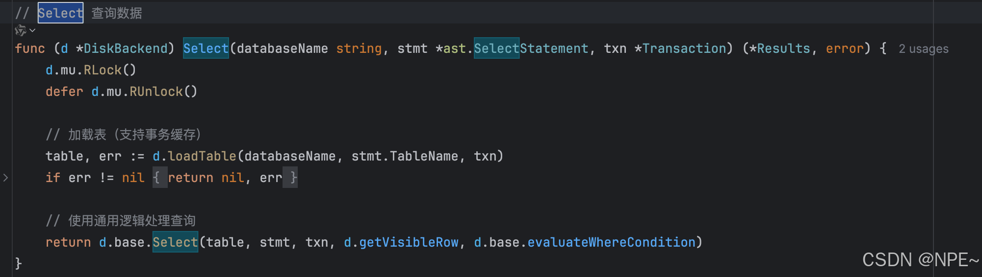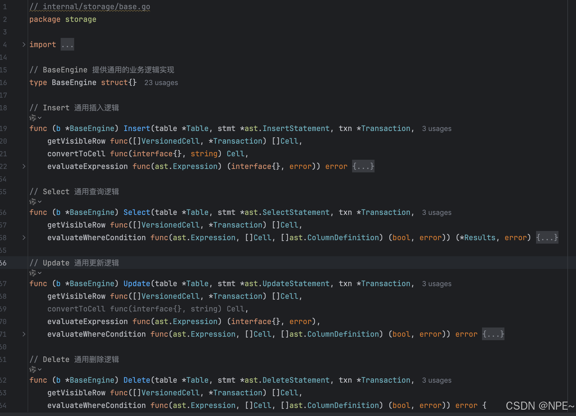 - 新增internal/storage/base.go文件,抽象baseEngine,因为MemoryBackend和DiskBackend解析SQL、调用函数、拼装结果等步骤是类似的,只是对结果的保存方式不同。因此我们可以抽取一个baseEngine,复用通用的逻辑。