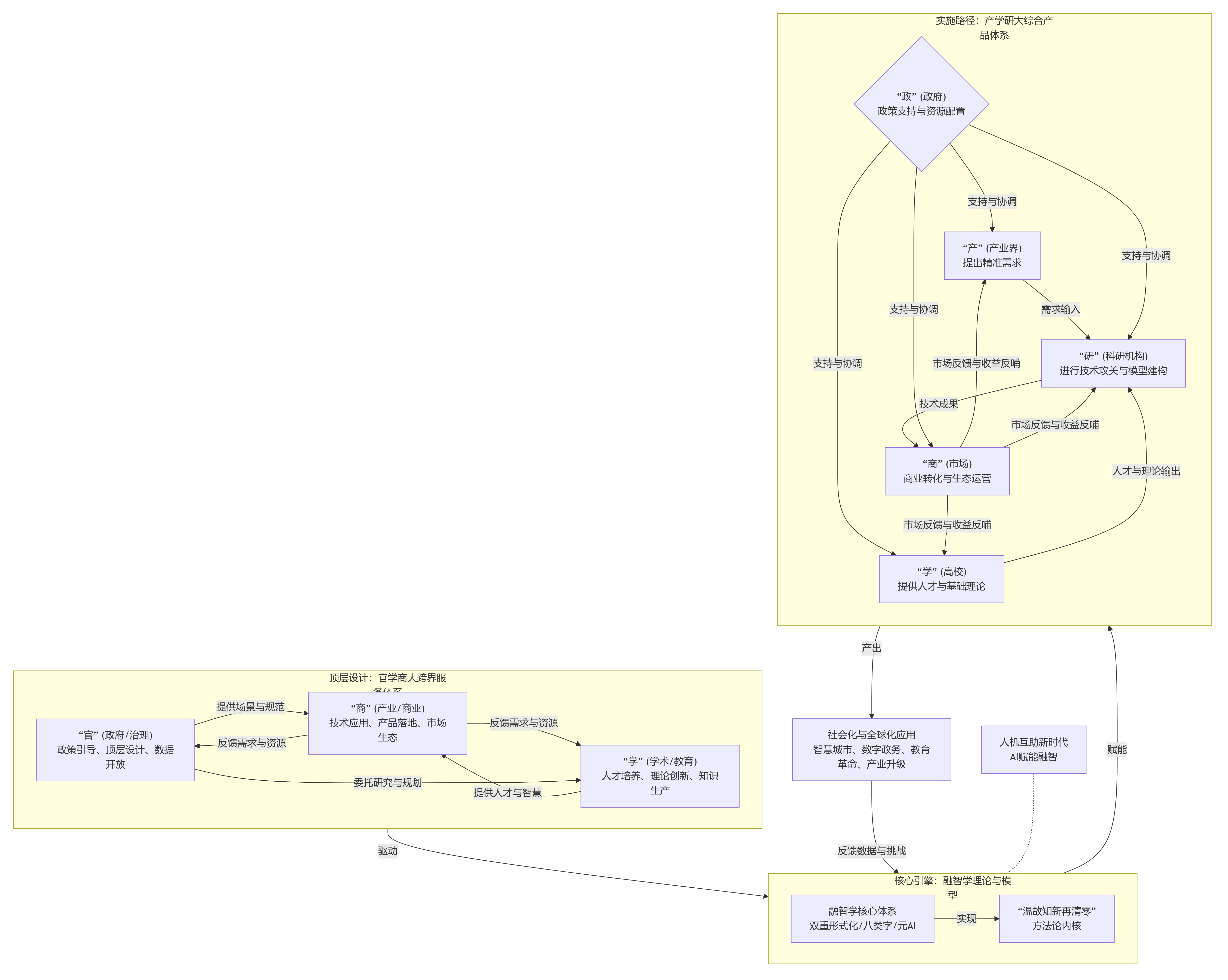 该图码系统性地展示了 融智学如何作为核心引擎 ,驱动 官、学、商三大领域 与产、学、研、政、商五大环节 的深度融合与价值循环: