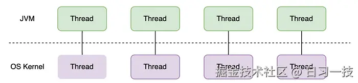 在引入虚拟线程之前,我们常使用 java.lang.Thread 来创建 Java 线程,这个线程被称为 平台线程(Platform Thread),它和操作系统的内核线程是一对一的关系,由内核线程调度器负责调度。