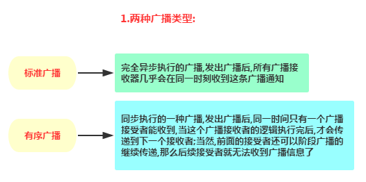 特点: 完全异步。发送后,所有匹配的接收器几乎同时收到广播,它们之间没有顺序,也无法中止广播。