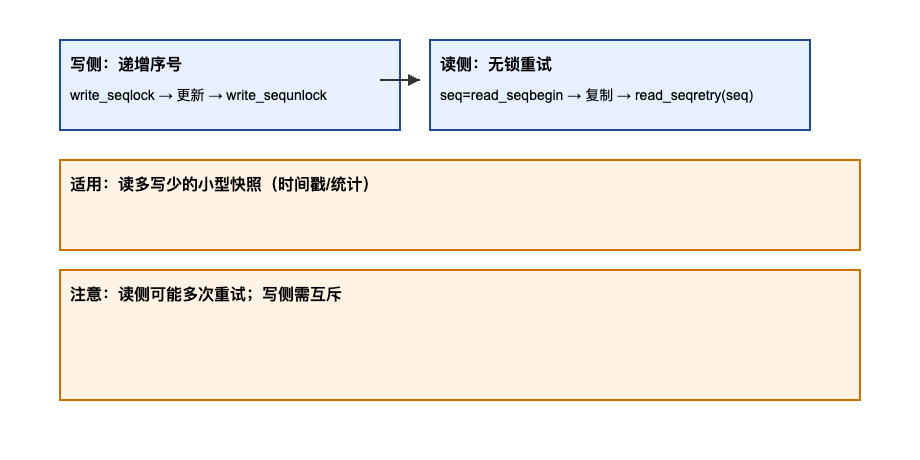 - 顺序锁通过"写方增加序号,读方无锁读取并重试"的模式,实现读路径的无锁一致性检查。