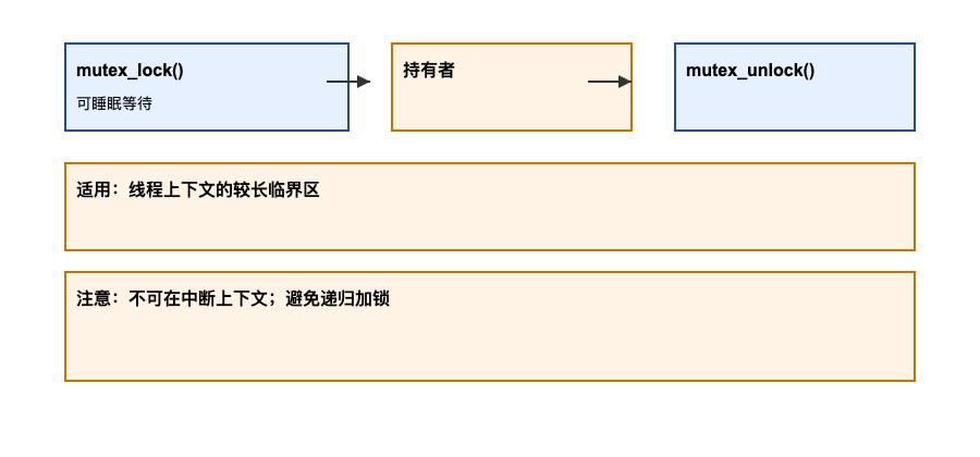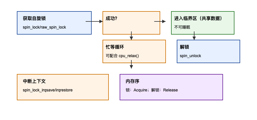 - 自旋锁通过忙等(busy-wait)在短临界区内实现互斥。持锁期间禁止调度,不能睡眠。