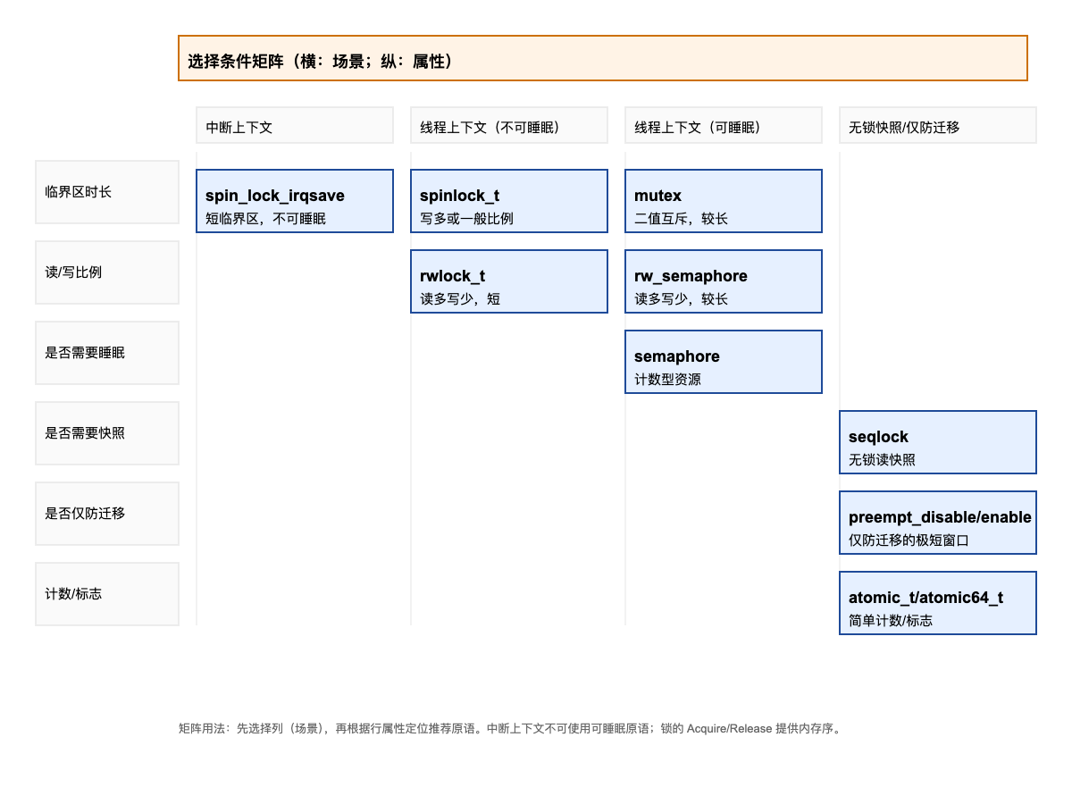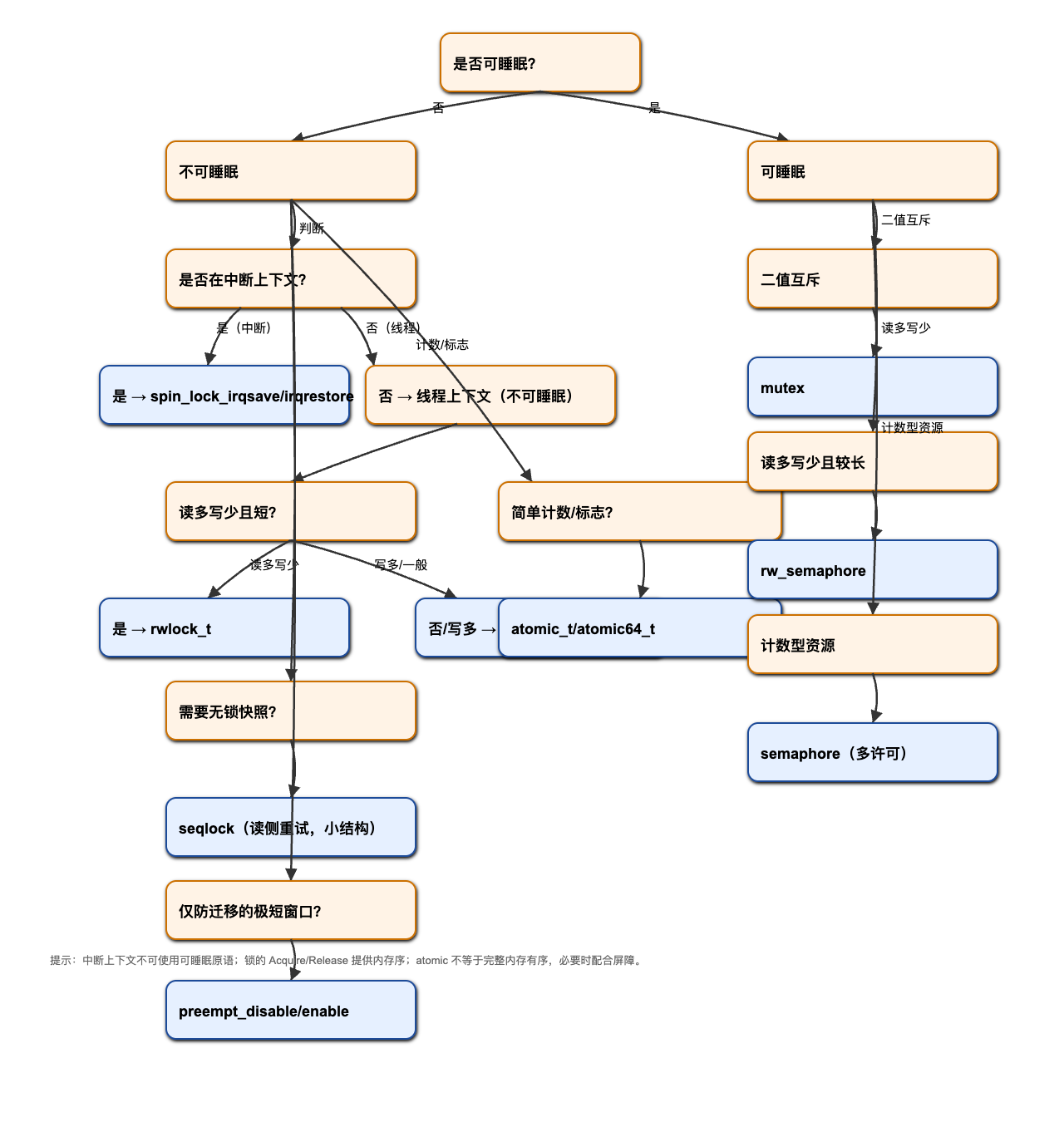 选择同步原语的核心是:理解"是否可睡眠、临界区长短、读写比例、是否在中断上下文、是否需要无锁读快照以及内存序要求"。遵循上述指引与注意事项,可在内核 4.4 环境下写出既正确又高效的并发代码。