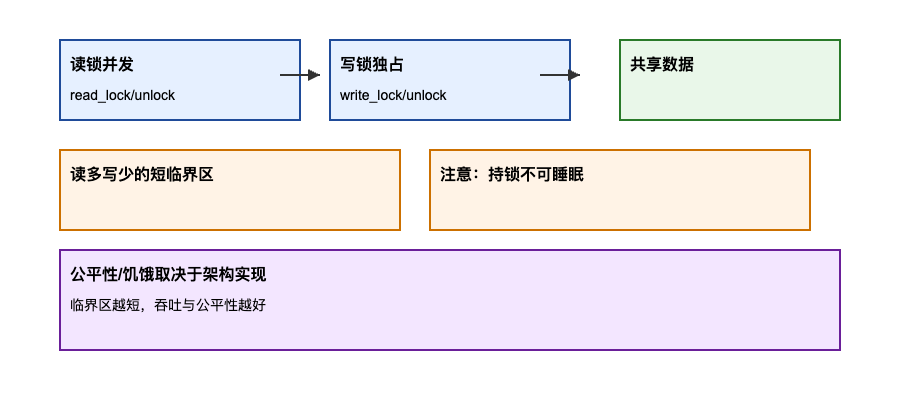- 性能权衡:读多写少优先读写锁或 seqlock;写多读少倾向普通互斥。