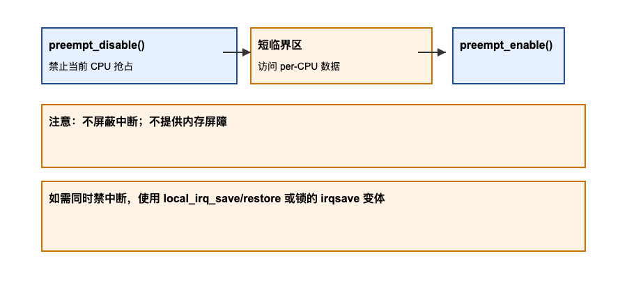 preempt_disable()禁止当前 CPU 上的内核抢占,preempt_enable()恢复。 - 常用于保护 per-CPU 数据访问的短窗口(避免迁移到其他 CPU 导致并发问题)。