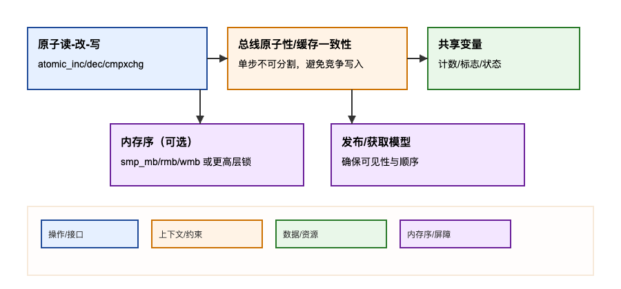 atomic_read(),atomic_set(),atomic_inc(),atomic_dec(),atomic_add_return(),atomic_cmpxchg()等。 - 内存序:大多数原子操作本身不隐含"全面的内存屏障"。读/写本身是原子的,但并不保证与其他内存访问的顺序;需要配合