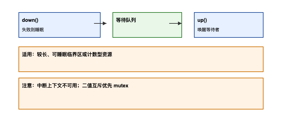 struct semaphore是可阻塞的计数型锁,线程在无法获取时会睡眠,适合较长临界区。- 典型接口: