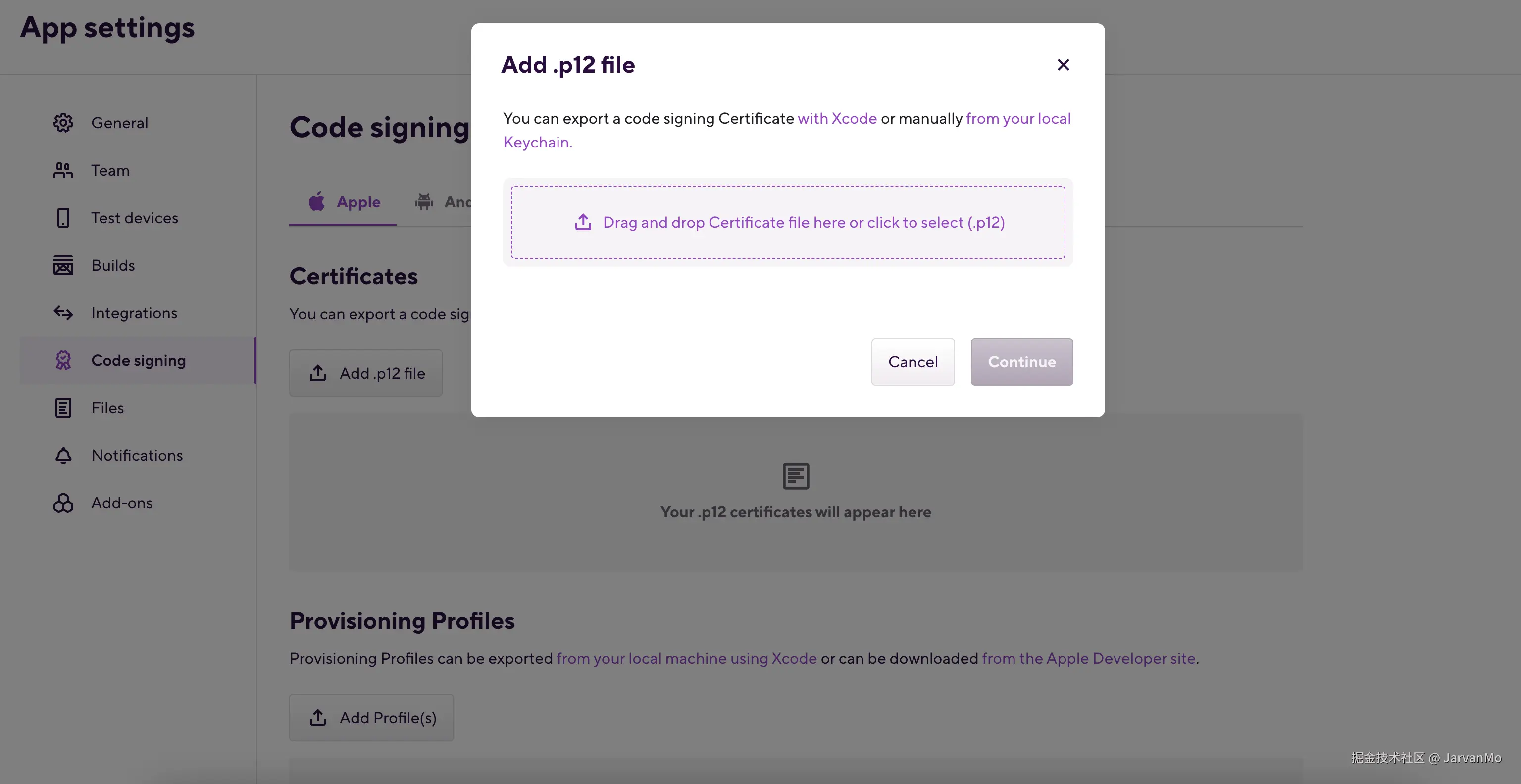 首先确保你的账号有Admin 权限,然后在Project setting=>Code signing中,点击Add .p12 file: