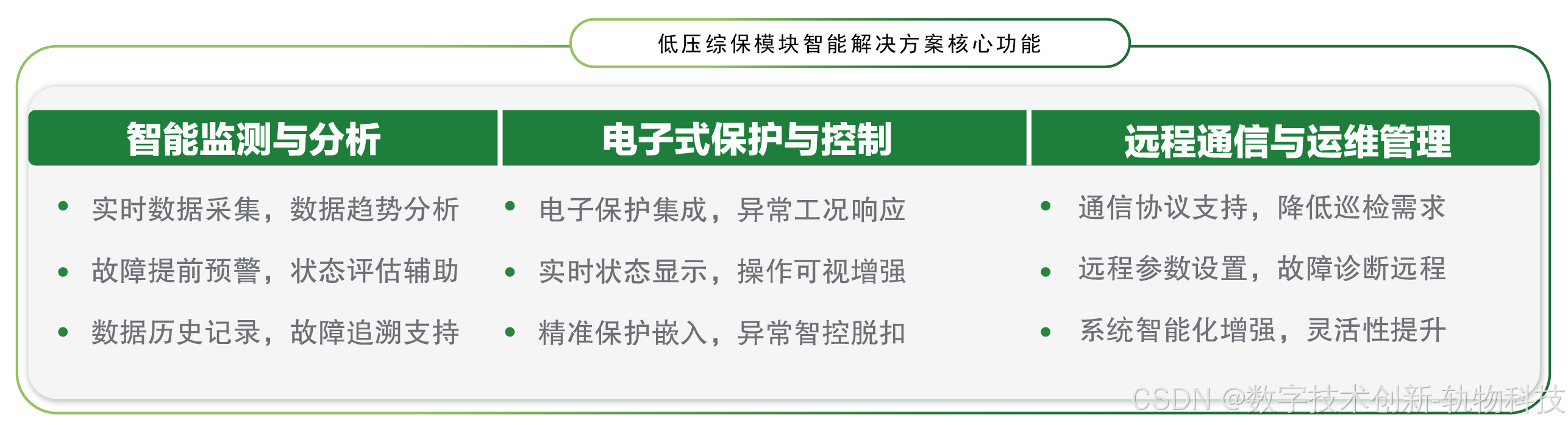 轨物科技,自2010年启航,十余载深耕物联网与人工智能技术创新,以产学研用闭环加速创新成果转化,深度服务制造业企业数智化转型升级。我们深知,低压配电系统的智能化是企业智慧能源管理不可或缺的一环。为此,轨物科技凭借在新能源、电力及装备领域积累的深厚技术底蕴,推出低压综保智慧运维一站式解决方案 ,旨在全程赋能企业技术创新与产品升级,让智能化转型之路更简单、更高效、更成功。