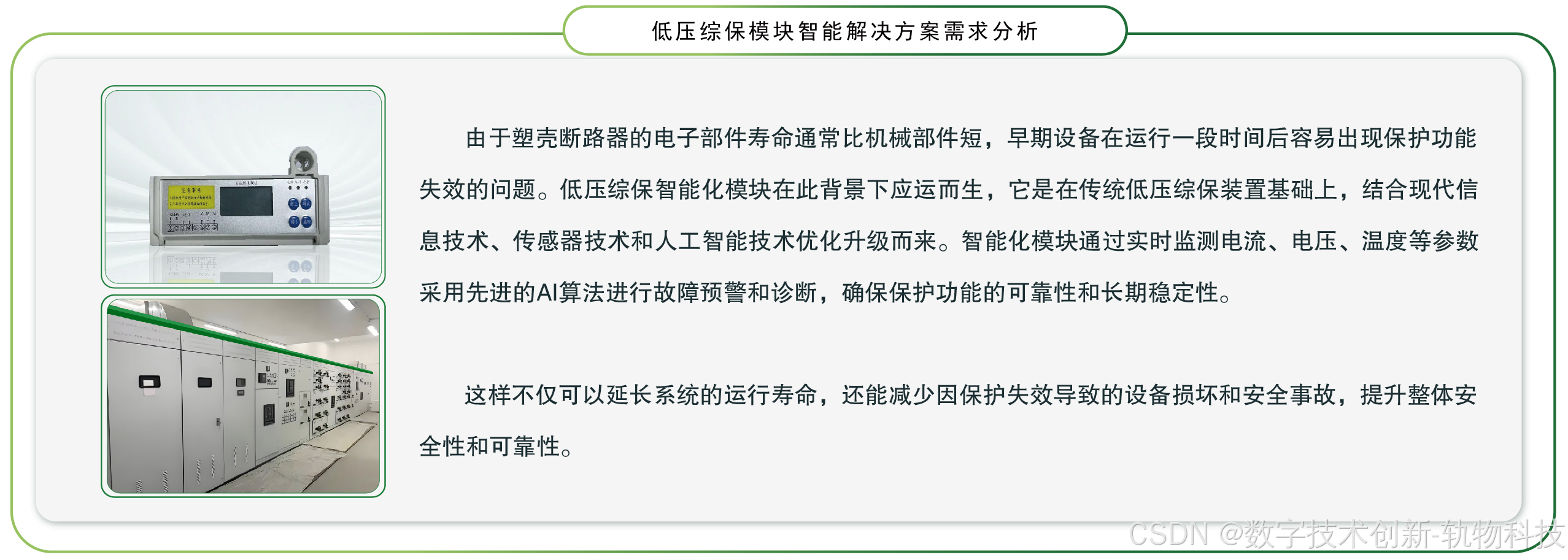 - 智能终端升级 :轨物科技提供具备高精度测量、多参数采集(电流、电压、功率、电能、功率因数、谐波、温度等)、边缘计算能力的智能综保单元,替代传统设备,实现数据"源头活水"。
