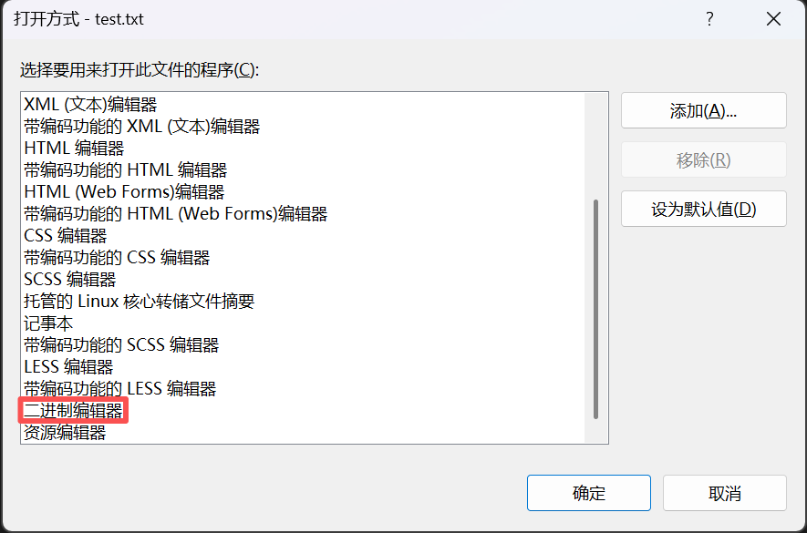 翻到最下面选择二进制编辑器后点击确定: