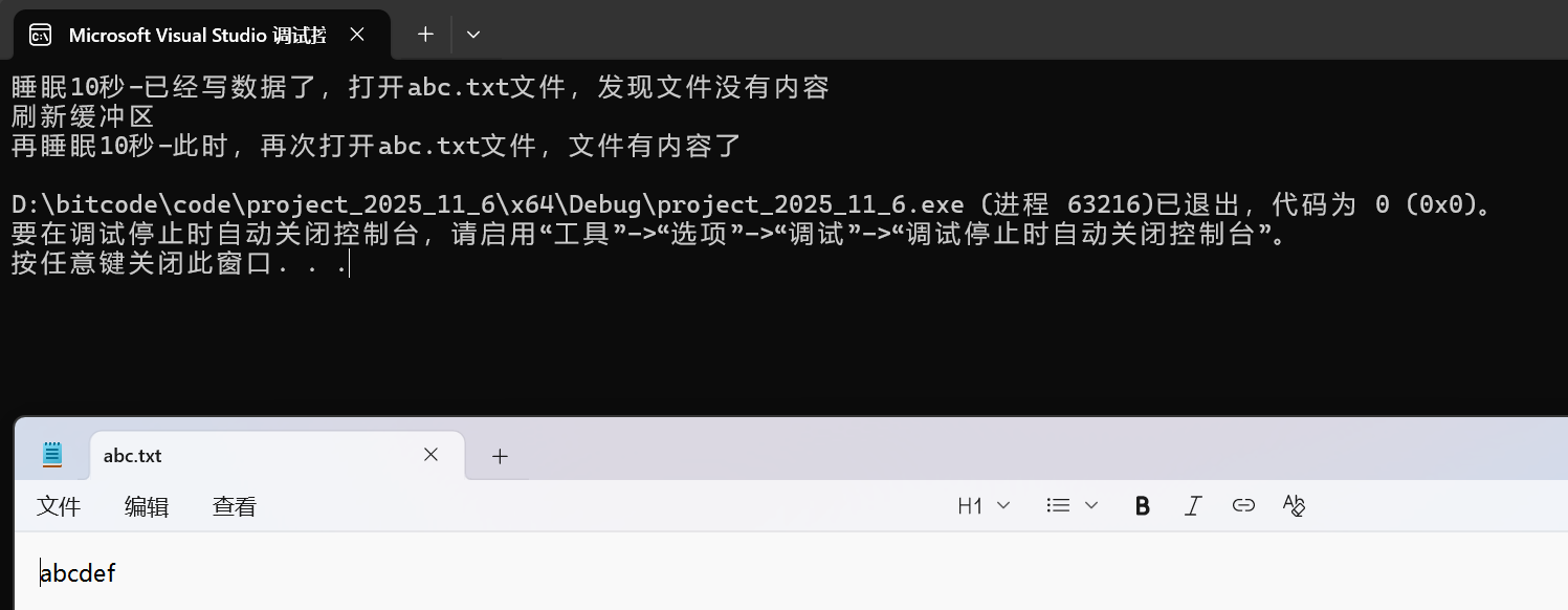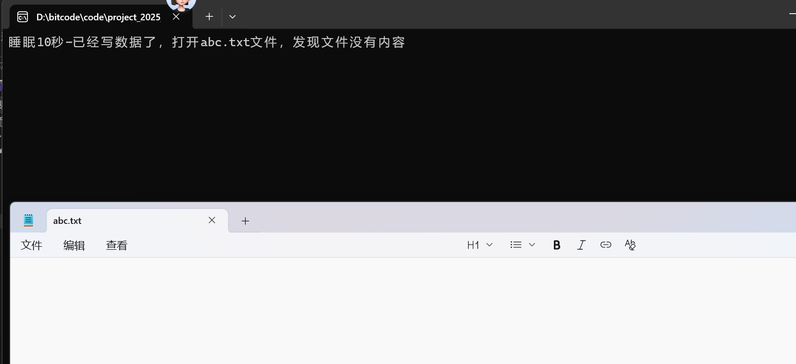 printf("再睡眠10秒-此时,再次打开abc.txt⽂件,⽂件有内容了\n");