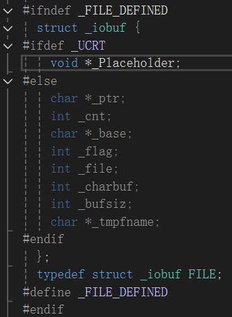 那么什么是文件指针呢?我们为每个被使用的文件都在内存中开辟了一个相应的文件信息区,用来存放文件的相关信息,比如说文件的名字、文件状态和文件当前的位置。这些信息保存在一个结构体变量之中,而该结构体类型又是由系统声明,取名为FILE。我们可以看看VS 2022中的stdio.h中的下面的文件类型声明:
