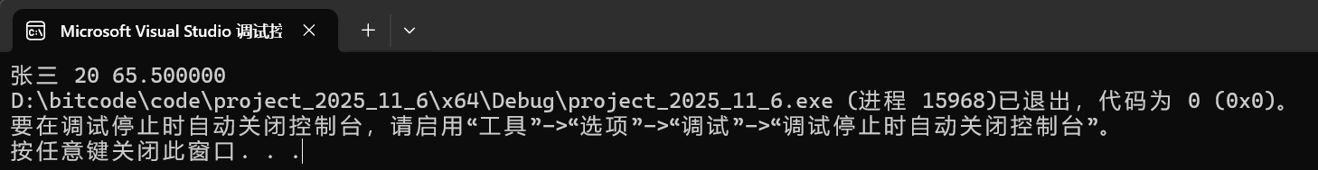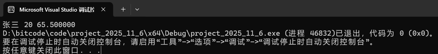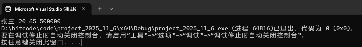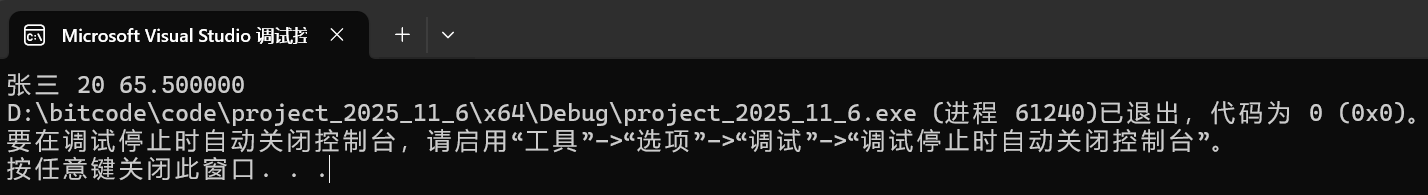 struct S s = { "张三", 20, 65.5f };