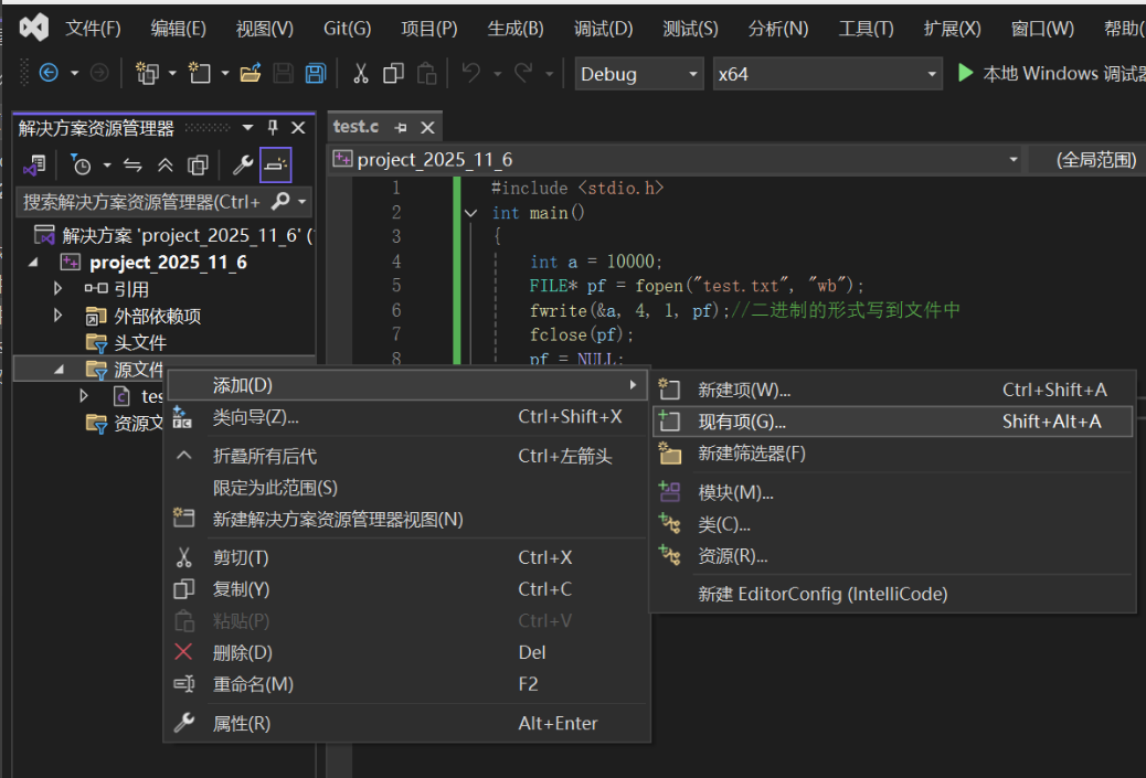 FILE* pf = fopen("test.txt", "wb");