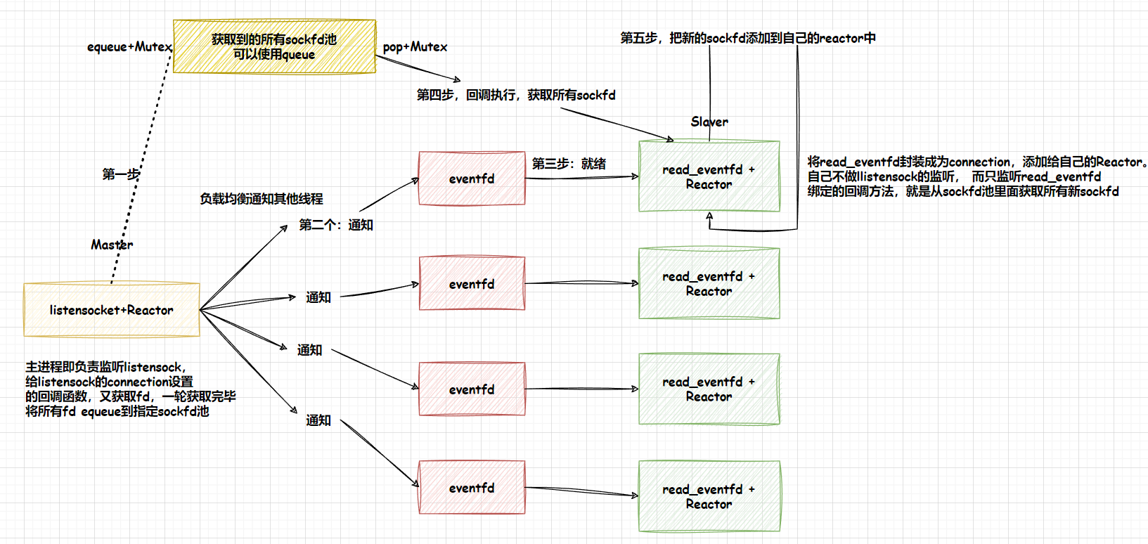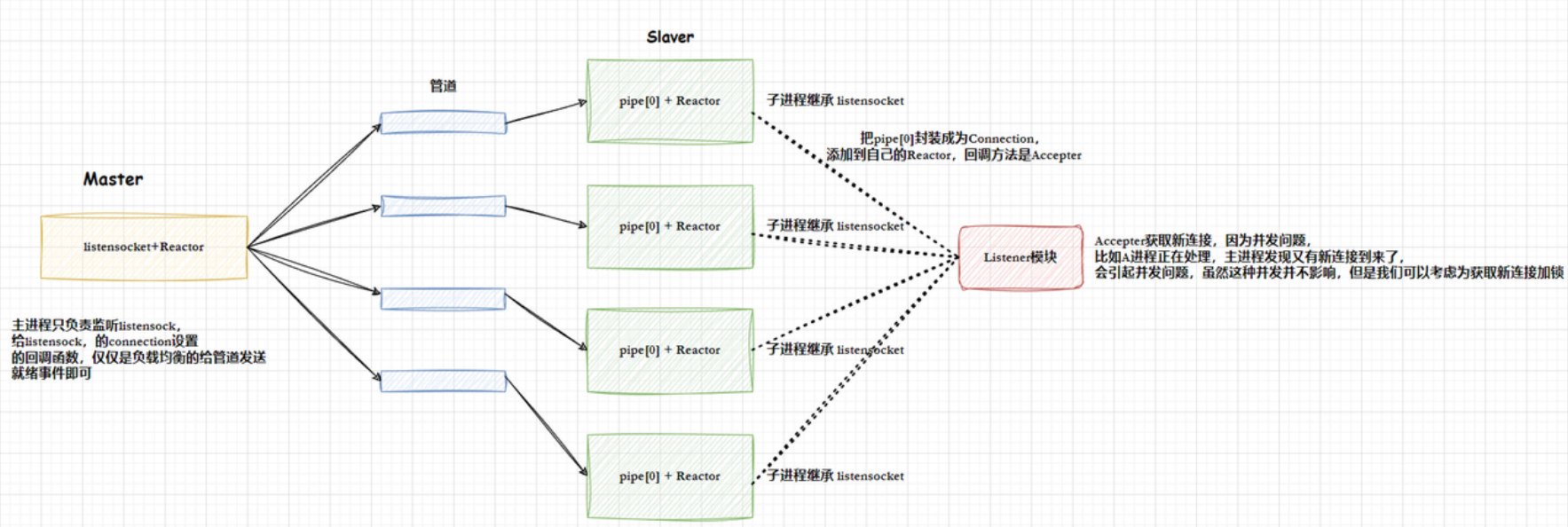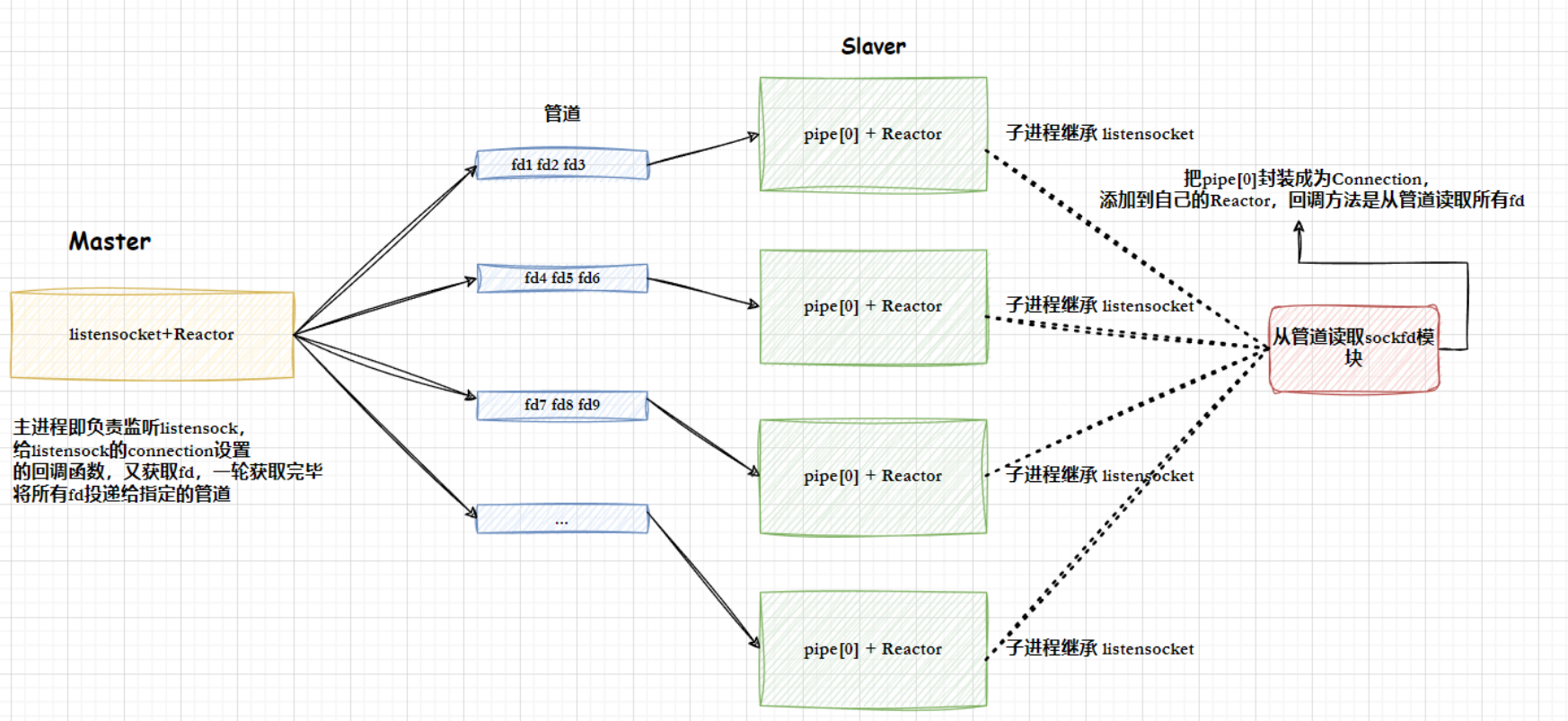 - 多线程是可以共享fd的,如果我们把工作职责变一下(其实就是修改一下connection回调方式),让master线程,检测并直接accepter到新的连接fd列表,然后通过管道传递给每一个子进程,每个子进程拿到sockfd,直接添加到自己的Reactor中,进行IO处理就行,这样做会更简单。