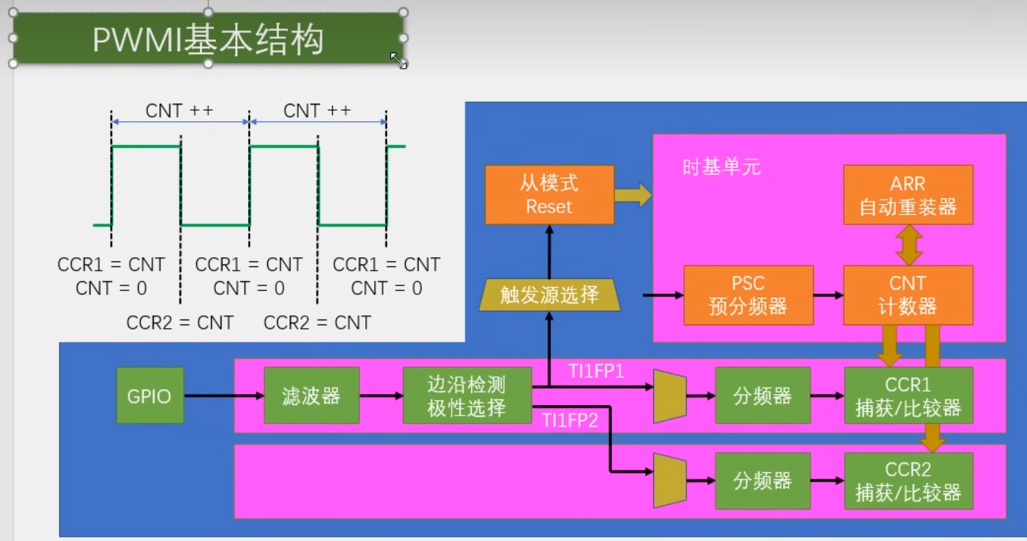 这个结构我们只使用了一个通道,所以只能用来测量频率。右上角是时基单元,我们把时基单元配置好,然后启动定时器。那么CNT就会在预分频之后的时钟驱动下,不断自增。这个CNT就是我们测周法用来计数记时的东西。
