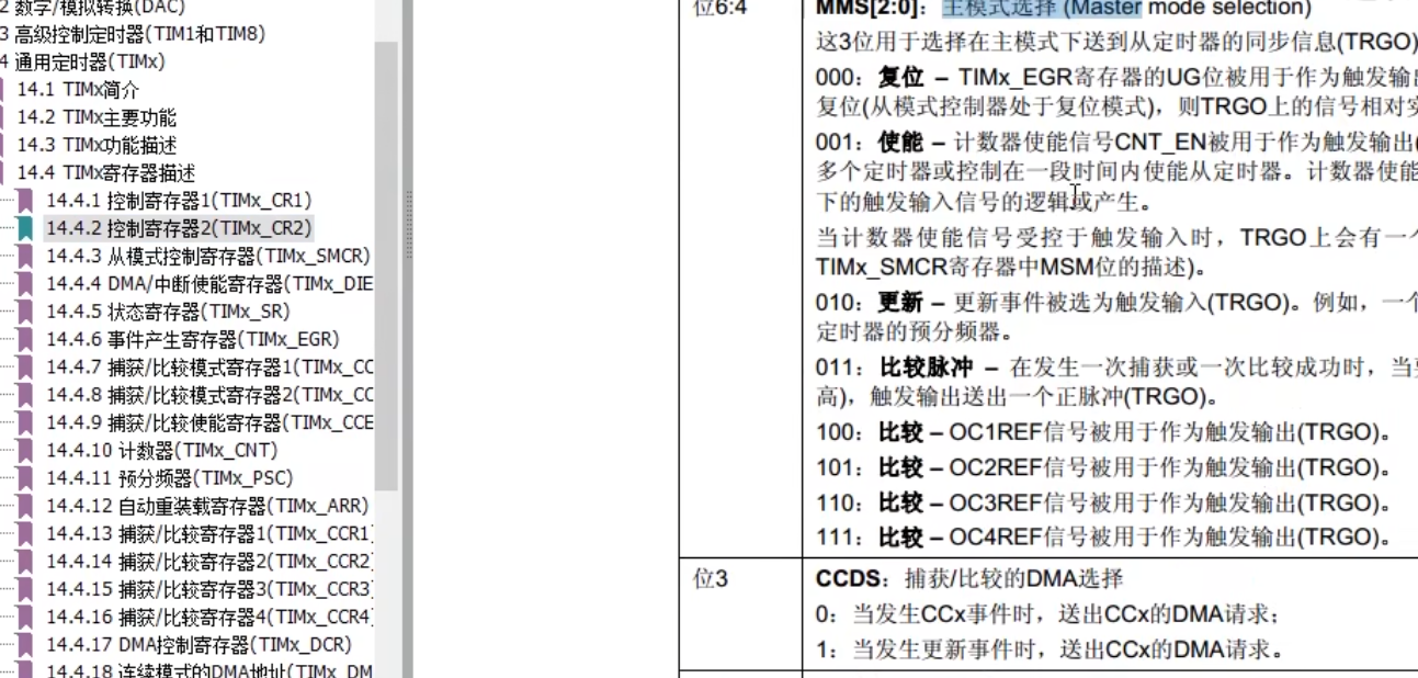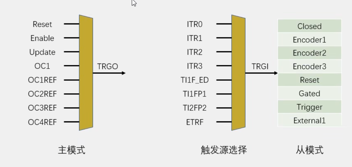 主模式可以将定时器内部的信号,映射到TRGO引脚,用于触发别的外设,所以这部分叫主模式