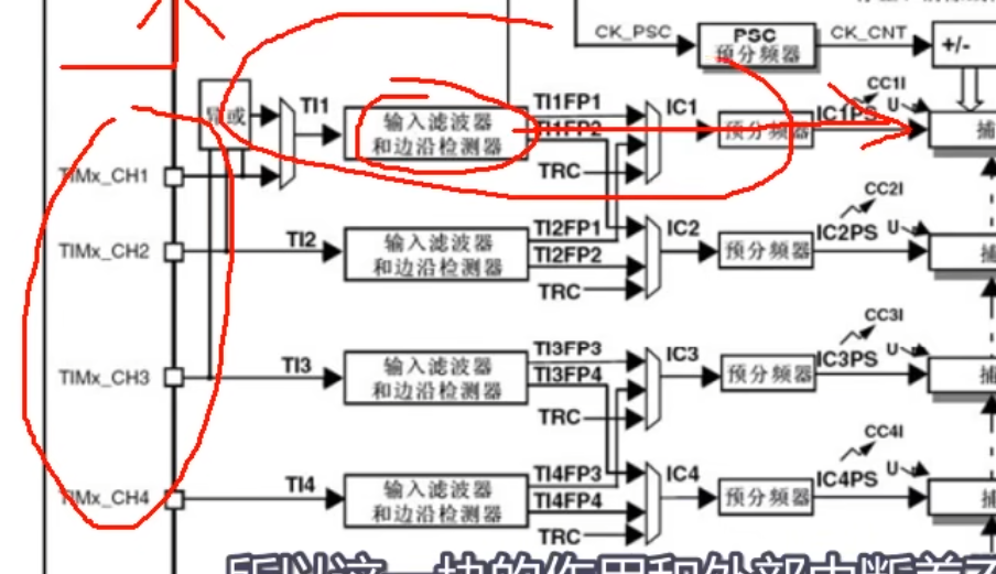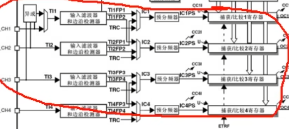 输入捕获的话就是,一旦这四个通道,有边沿的变化,那么输入滤波和边沿检测就会发现这个变化,让输入捕获电路产生动作。让当前CNT的值,锁存到CCR中,和外部中断差不多,外部中断是向CPU申请中断,然而输入捕获是控制后续电路。