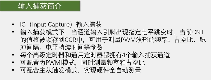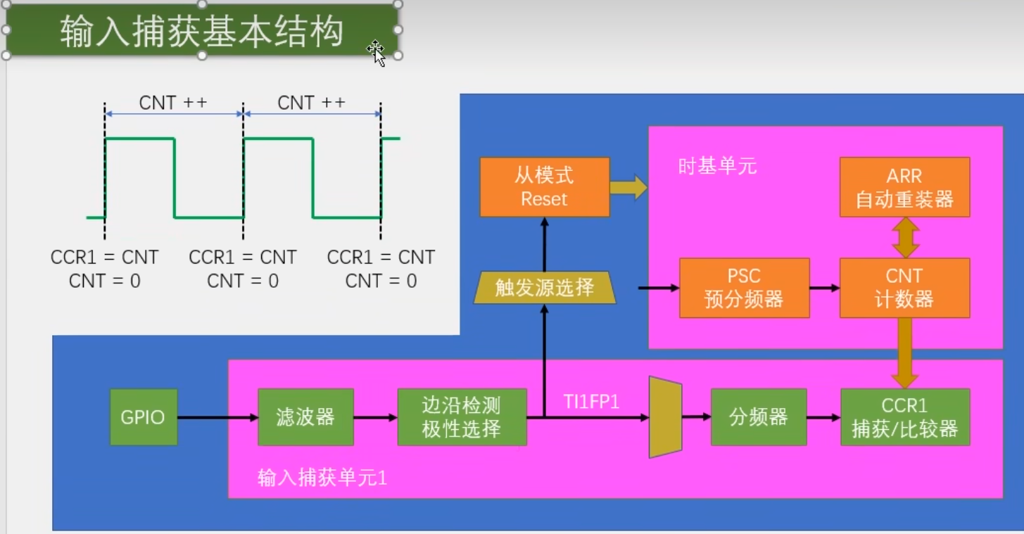 输入捕获引脚是输入端口。是接收到输入信号,让当前CNT的值,锁存到CCR中。