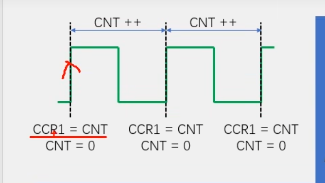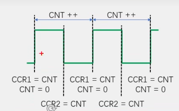 在这里我们可以看到信号出现一个上升沿时候,CCR1=CNT,就是把CNT的值放在CCR1里面。然后CNT=0,计数器清零。这是从模式自动执行的。然后一个周期内,CNT在基准时钟的信号下,不断自增。直到下一个上升沿到来。