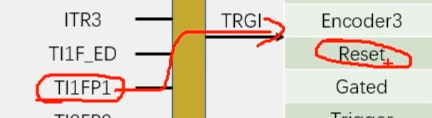如果想要完成我们刚才的任务,让TI1FP1自动触发CNT清零,那么触发源选择,就可以选择TI1FP1,映射到TRGI,然后执行reset操作。这样TI1FP1的信号就可以自动触发从模式,然后从模式就会自动清零CNT的值。实现硬件全自动清零。